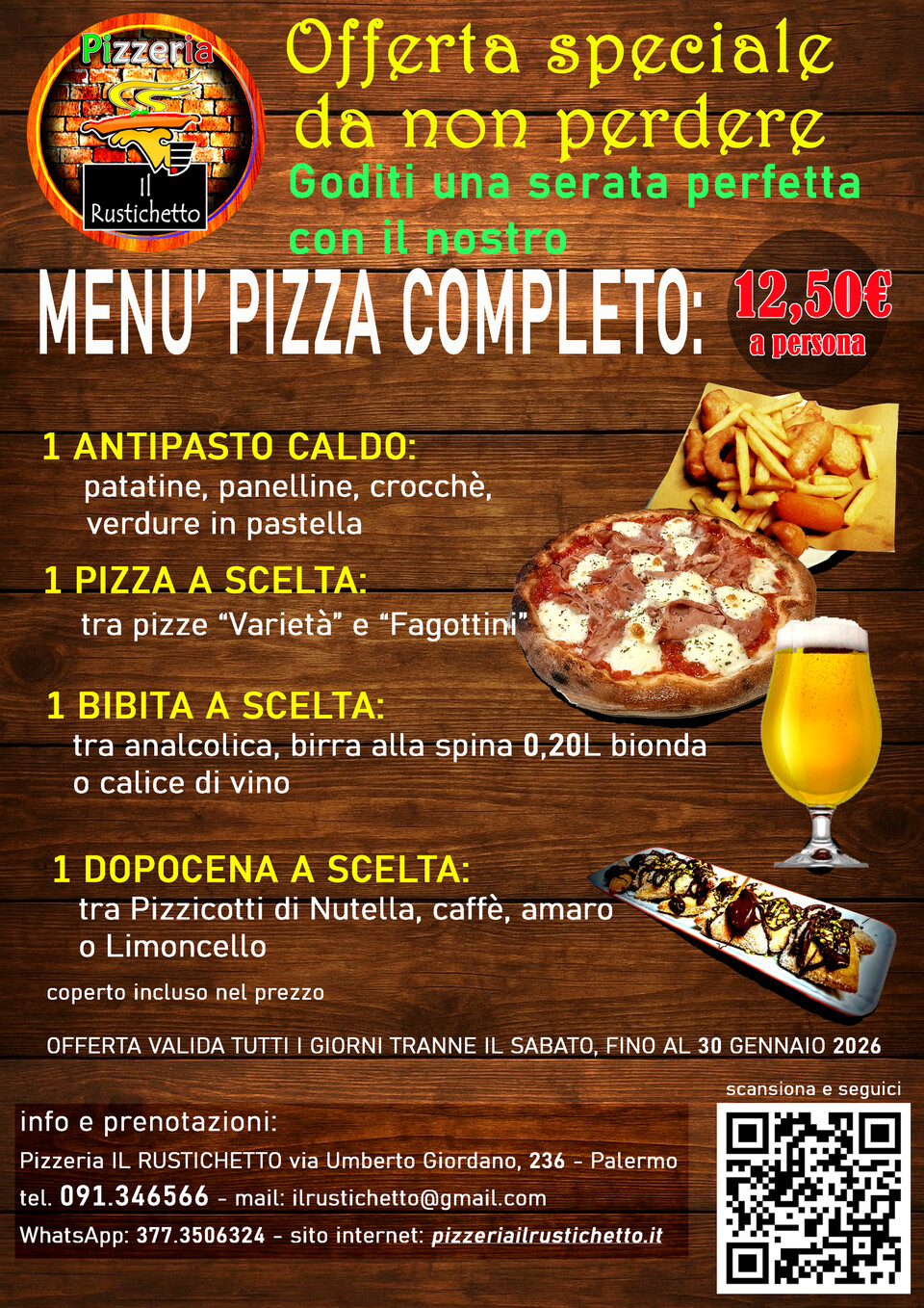 PROMO Inverno 2026 : antipasto caldo + pizza + dessert + bibita + coperto